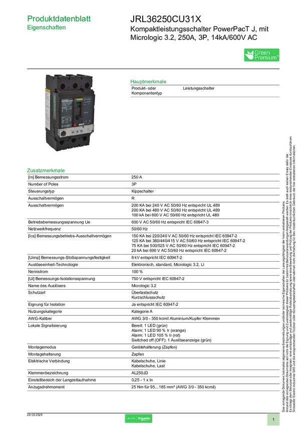 JRL36250CU31X Wyłącznik zasilania Schneider Electric JRL36250CU31X 1 szt.