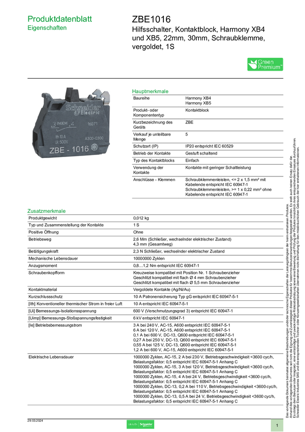 ZBE1016 Blok przełącznika pomocnicznego Schneider Electric ZBE1016, 5 szt.