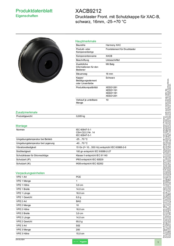 XACB9212 Schneider Electric XACB9212 Element przedni z przyciskiem 10 szt.
