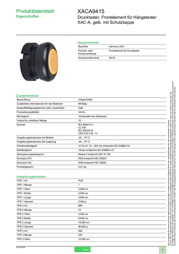 XACA9415 Schneider Electric XACA9415 Element przedni z przyciskiem 10 szt.