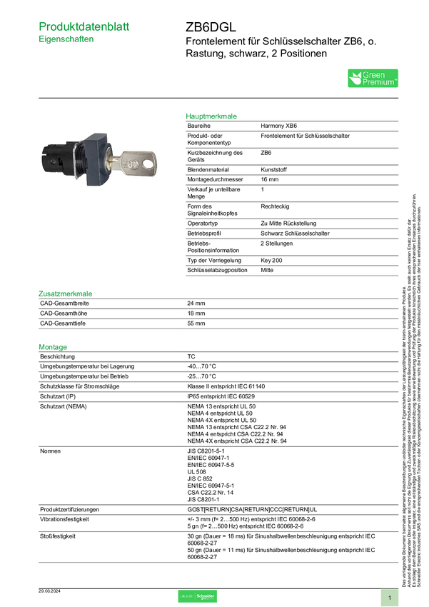 Schneider Electric ZB6DGL Przełącznik kluczykowy (stacyjkowy), przedni element 1 szt.
