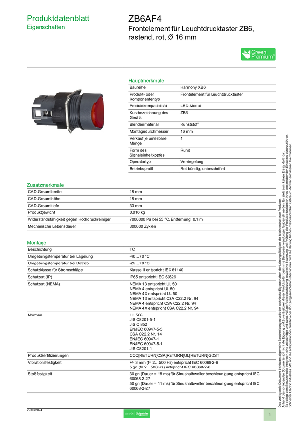 ZB6AF4 Schneider Electric ZB6AF4 Podświetlany element przedni z przyciskiem 1 szt.