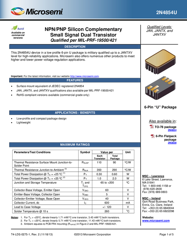 2N4854U-Dual-Transistor, 2N4854U-Transistor, 2N4854U-TR-Transistor