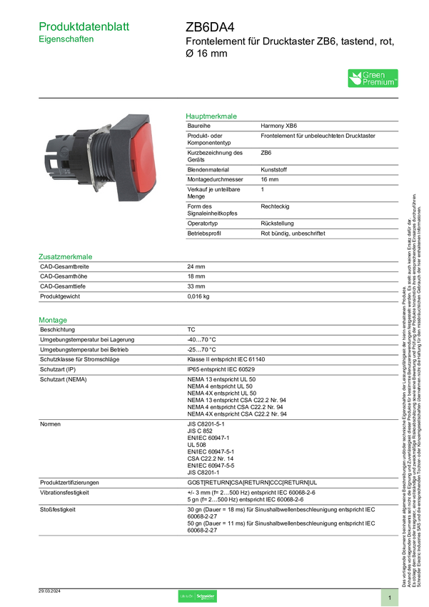 ZB6DA4 Schneider Electric ZB6DA4 Element przedni z przyciskiem 1 szt.