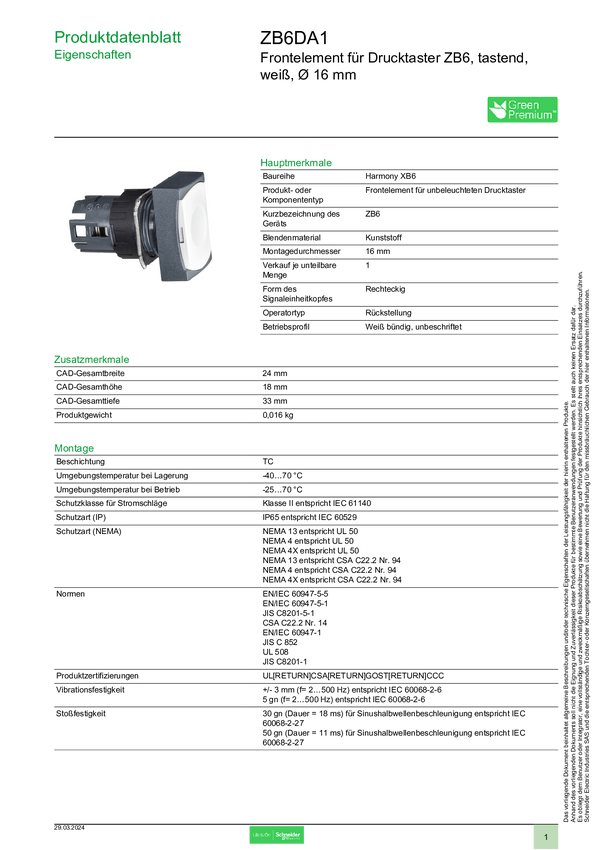 Schneider Electric ZB6DA1 Element przedni z przyciskiem 1 szt.