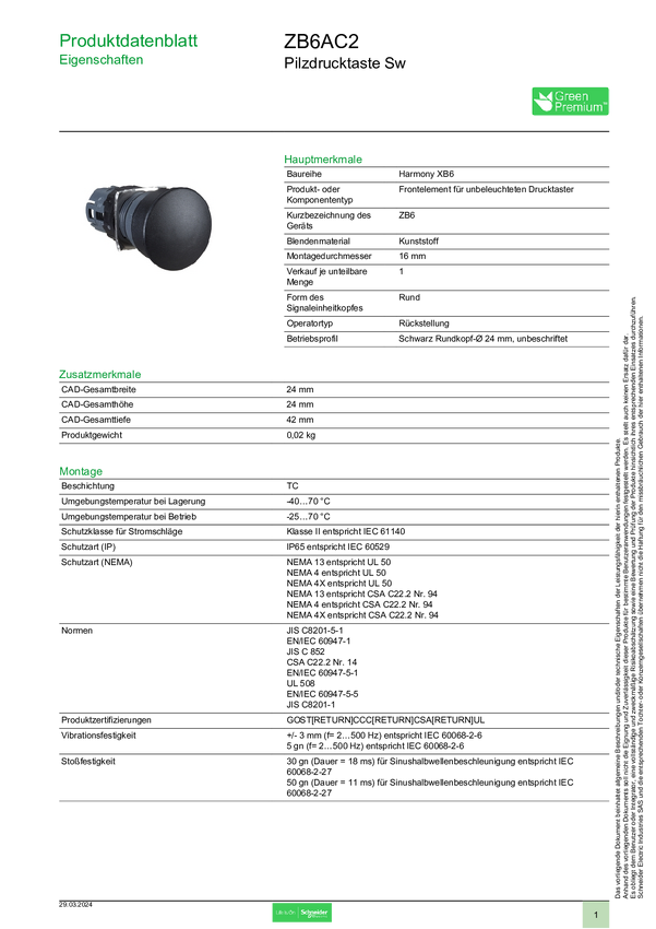 Schneider Electric ZB6AC2 Przycisk grzybkowy 1 szt.