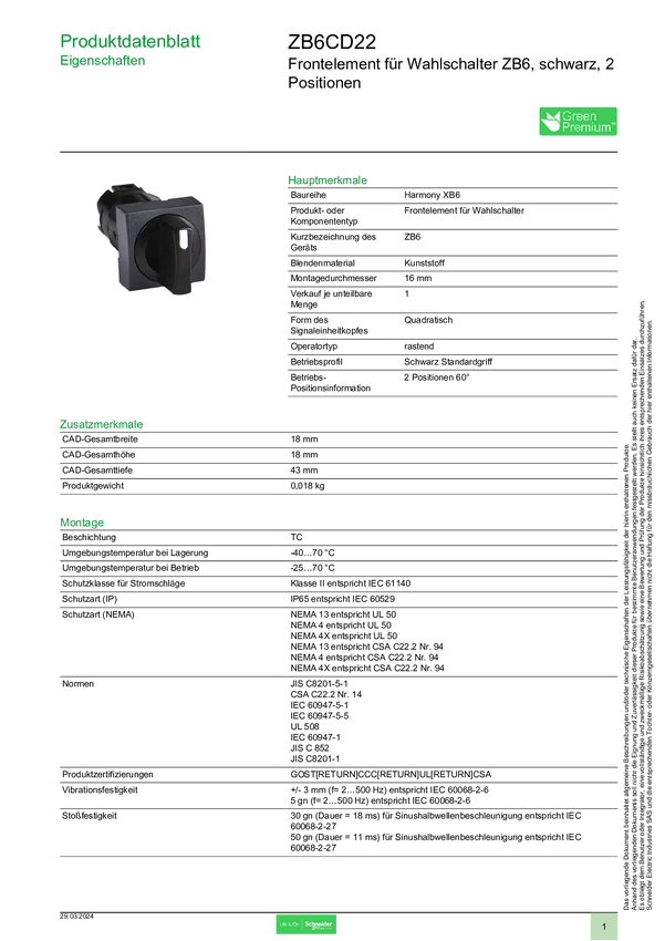 ZB6CD22 Schneider Electric ZB6CD22 Przełącznik wyboru, przedni element 1 szt.