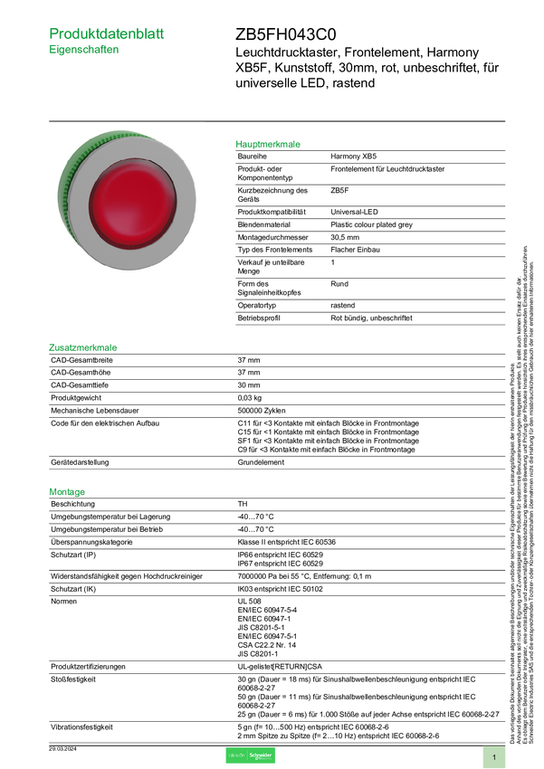 ZB5FH043C0 Schneider Electric ZB5FH043C0 Element przedni z przyciskiem 1 szt.