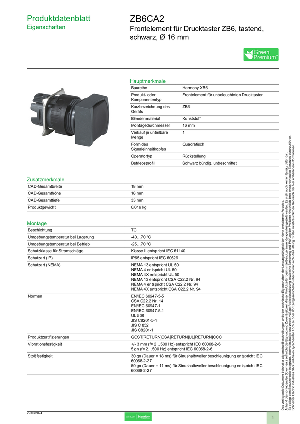 ZB6CA2 Schneider Electric ZB6CA2 Element przedni z przyciskiem 1 szt.