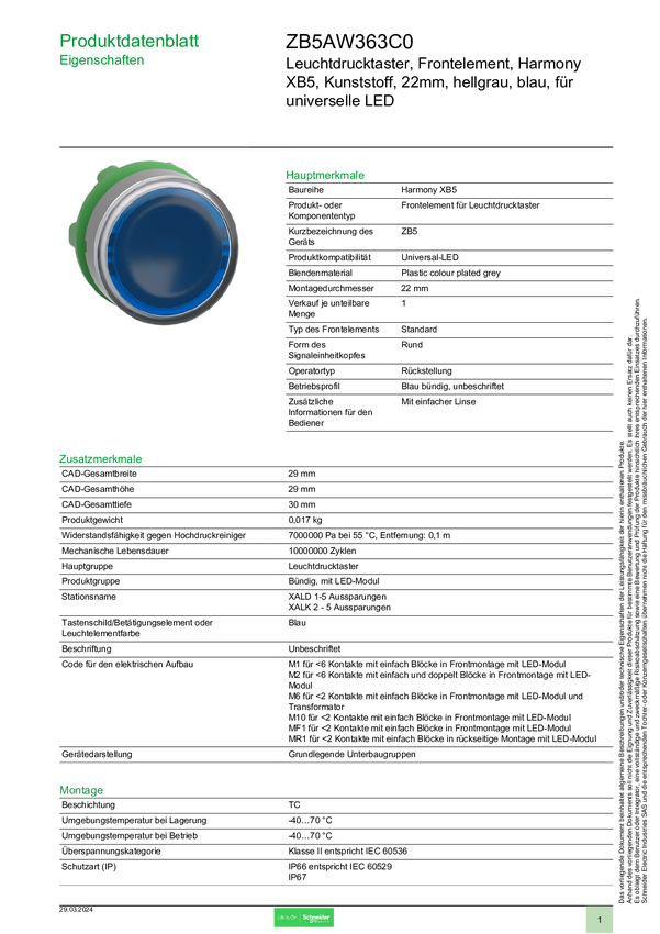 ZB5AW363C0 Schneider Electric ZB5AW363C0 Element przedni z przyciskiem 1 szt.
