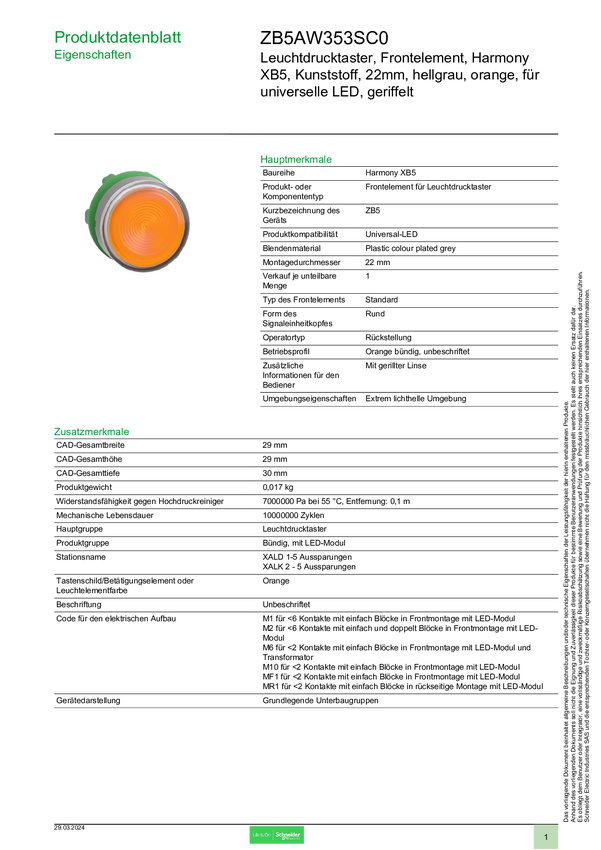 Schneider Electric ZB5AW353SC0 Element przedni z przyciskiem 1 szt.