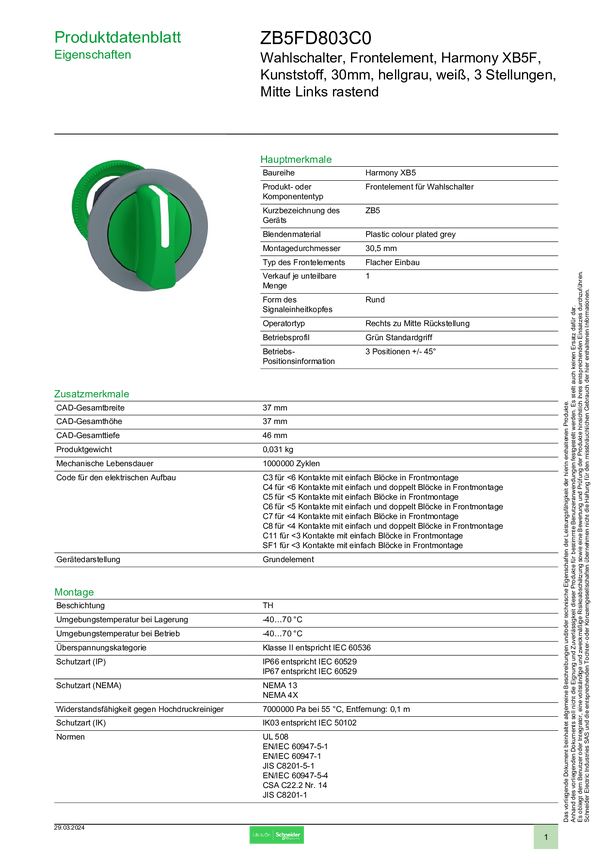 ZB5FD803C0 Schneider Electric ZB5FD803C0 Przełącznik wyboru, przedni element 1 szt.