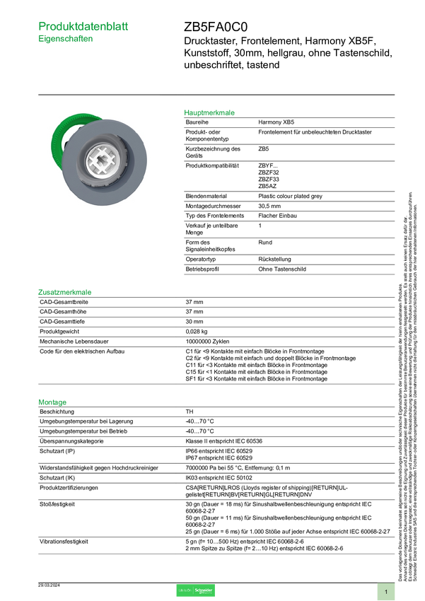 ZB5FA0C0 Schneider Electric ZB5FA0C0 Element przedni z przyciskiem 1 szt.