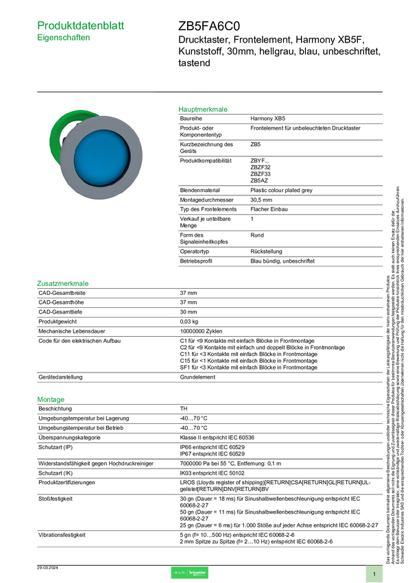 ZB5FA6C0 Schneider Electric ZB5FA6C0 Element przedni z przyciskiem 1 szt.