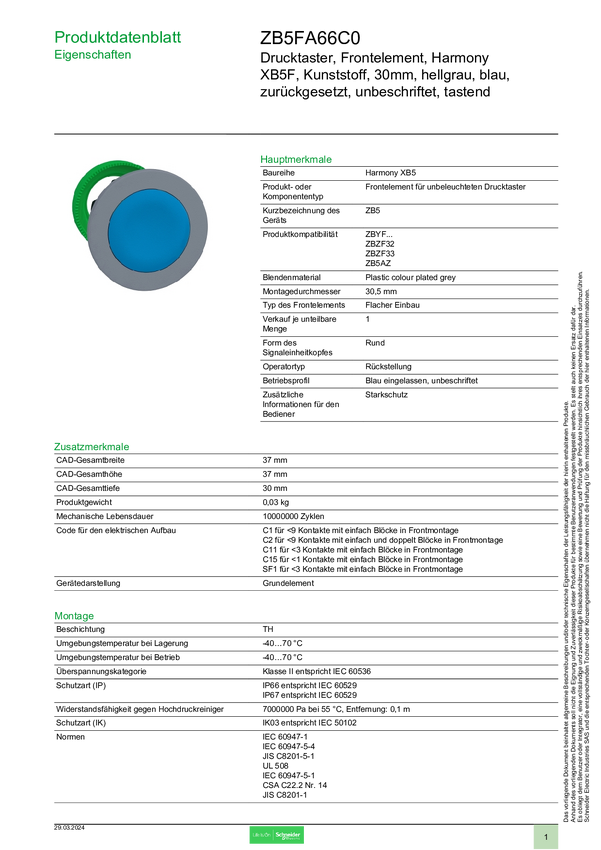 ZB5FA66C0 Schneider Electric ZB5FA66C0 Element przedni z przyciskiem 1 szt.