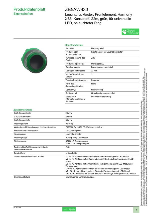 ZB5AW933 Schneider Electric ZB5AW933 Podświetlany element przedni z przyciskiem 1 sz...