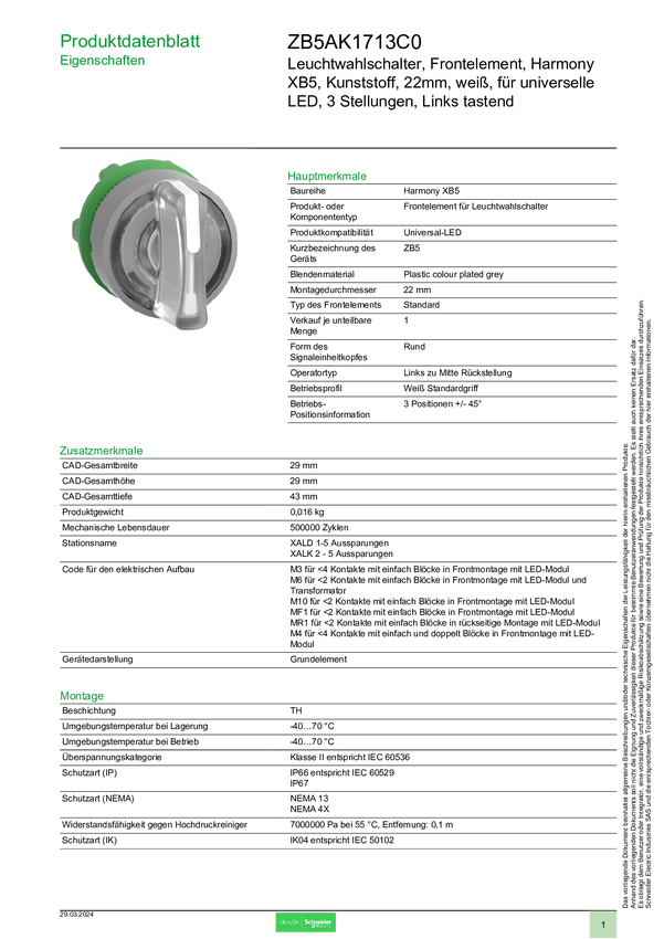 ZB5AK1713C0 Schneider Electric ZB5AK1713C0 Przedni element przełącznika selekcyjnego św...