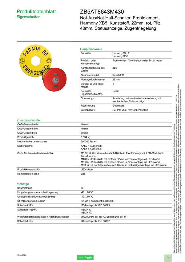 Schneider Electric ZB5AT8643M430 Przycisk grzybkowy - przedni element 1 szt.