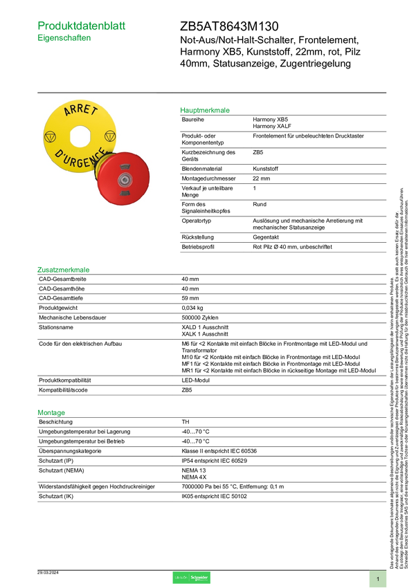Schneider Electric ZB5AT8643M130 Przycisk grzybkowy - przedni element 1 szt.