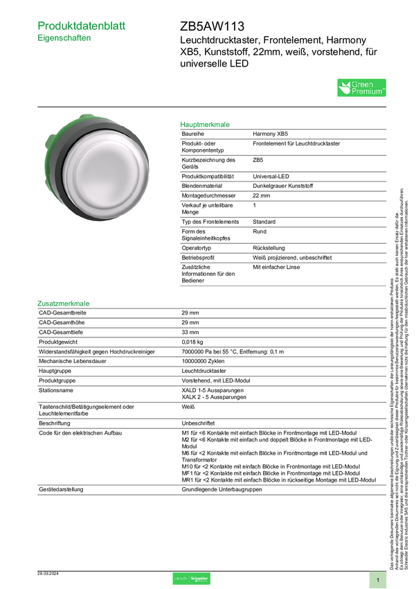 Schneider Electric ZB5AW113 Podświetlany element przedni z przyciskiem 1 szt.