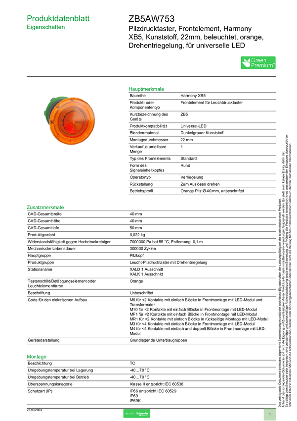 Schneider Electric ZB5AW753 Przycisk grzybkowy - przedni element 1 szt.