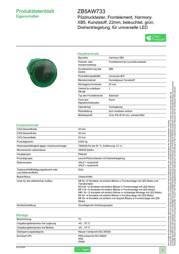 Schneider Electric ZB5AW733 Przycisk grzybkowy - przedni element 1 szt.