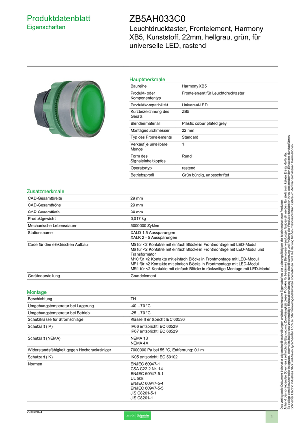 ZB5AH033C0 Schneider Electric ZB5AH033C0 Element przedni z przyciskiem 1 szt.