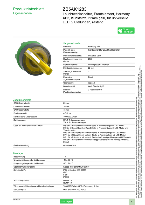 Schneider Electric ZB5AK1283 Przedni element przełącznika selekcyjnego światła 1 szt.