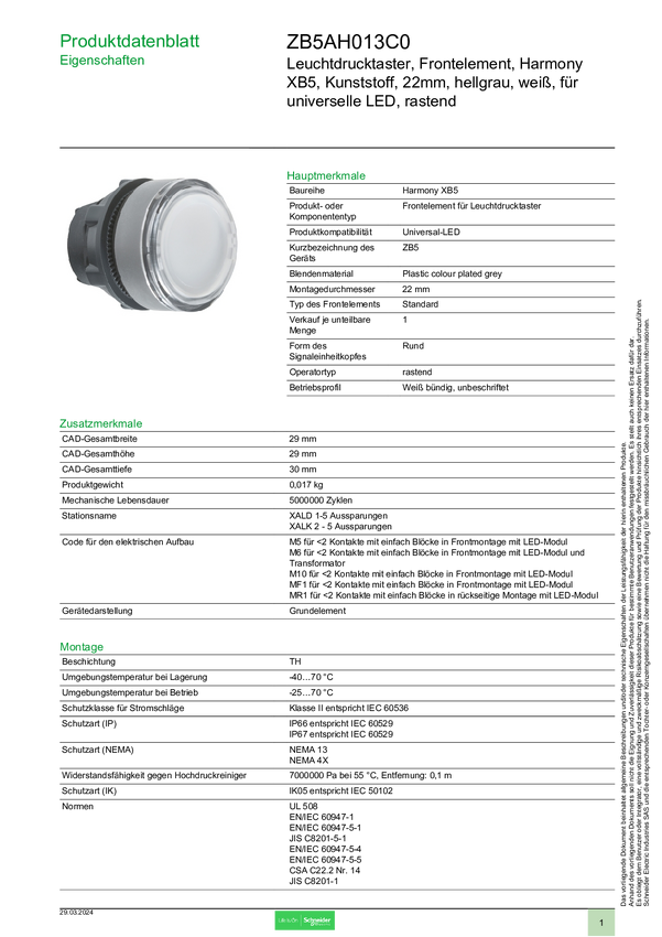 Schneider Electric ZB5AH013C0 Element przedni z przyciskiem 1 szt.