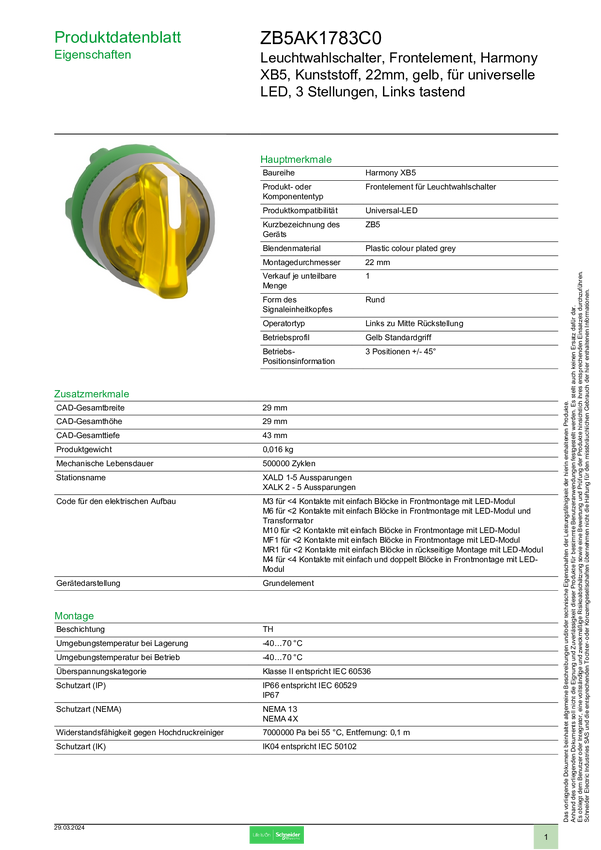 Schneider Electric ZB5AK1783C0 Przedni element przełącznika selekcyjnego światła 1 szt.