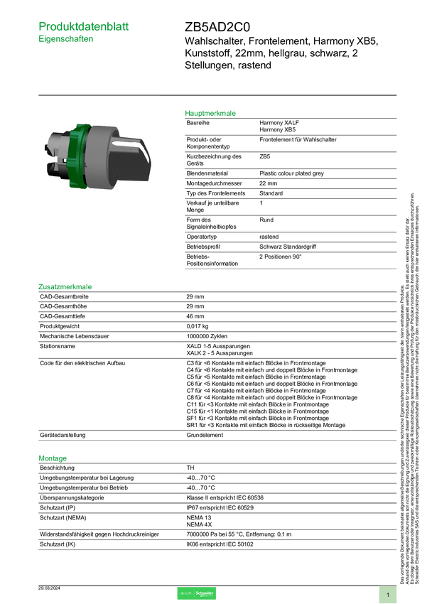 Schneider Electric ZB5AD2C0 Przełącznik wyboru, przedni element 1 szt.