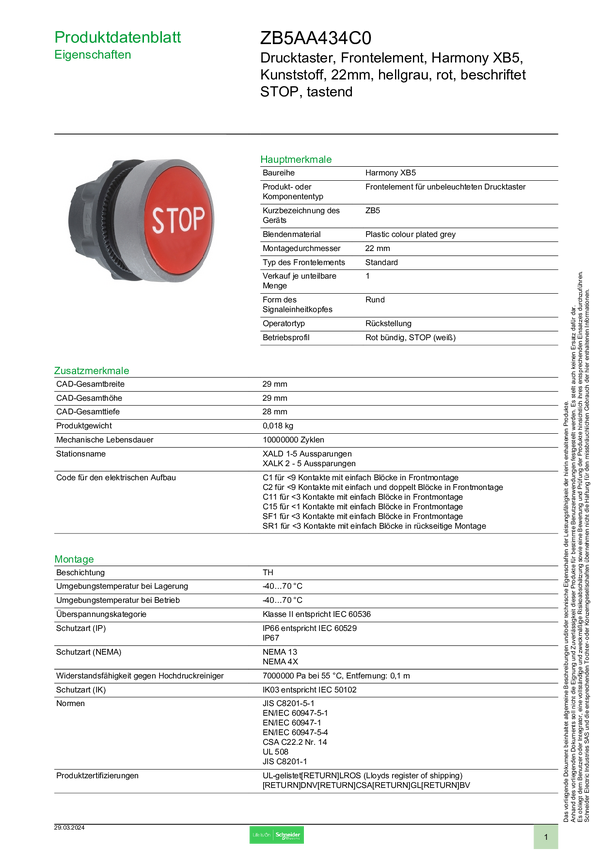 ZB5AA434C0 Schneider Electric ZB5AA434C0 Element przedni z przyciskiem 1 szt.
