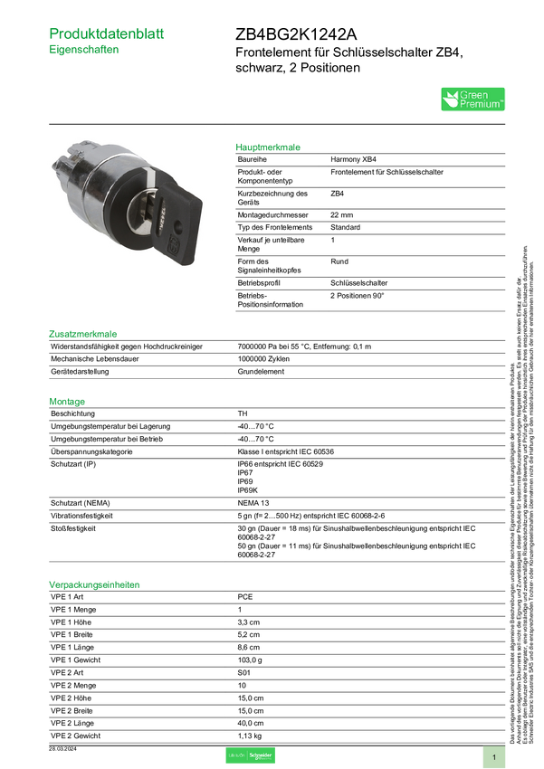 ZB4BG2K1242A Schneider Electric ZB4BG2K1242A Przełącznik kluczykowy (stacyjkowy), przedn...