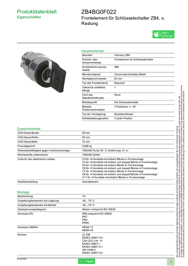 Schneider Electric ZB4BG0F022 Przełącznik kluczykowy (stacyjkowy), przedni element 1 szt.