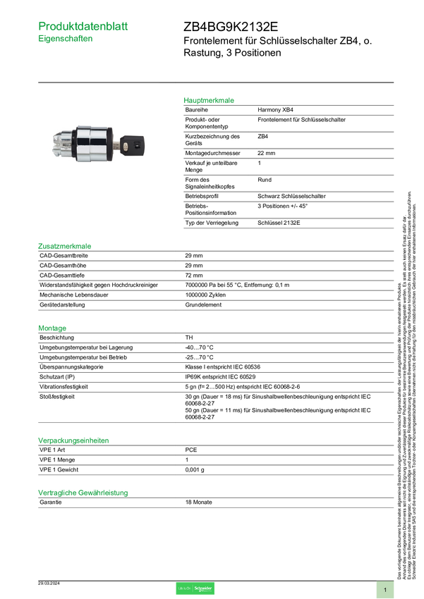 Schneider Electric ZB4BG9K2132E Przełącznik kluczykowy (stacyjkowy), przedni element 1 szt.