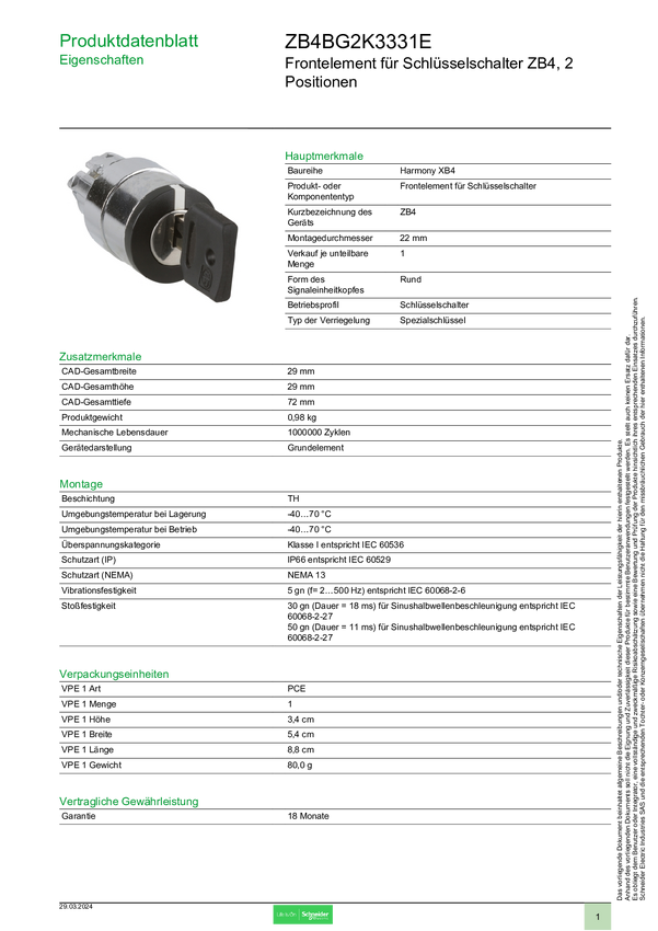 Schneider Electric ZB4BG2K3331E Przełącznik kluczykowy (stacyjkowy), przedni element 1 szt.