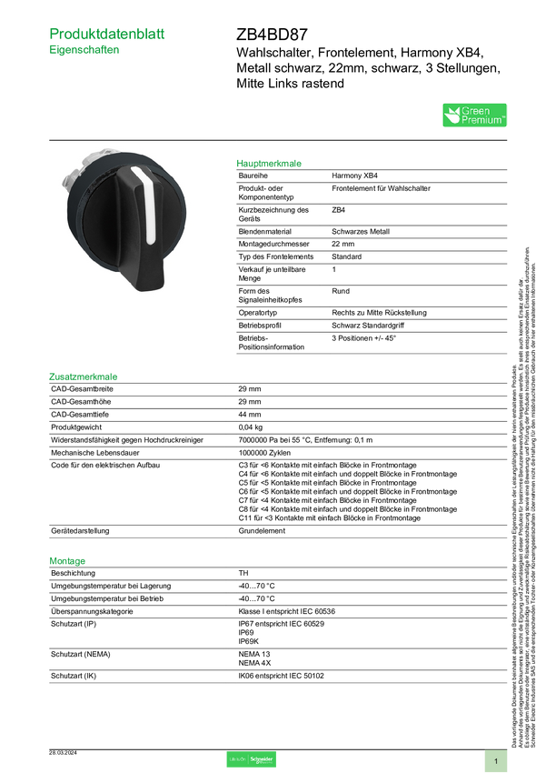 Schneider Electric ZB4BD87 Przełącznik wyboru, przedni element 1 szt.