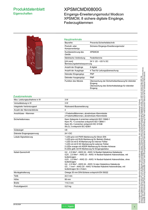 Moduł rozszerzający Schneider Electric XPSMCMDI0800G