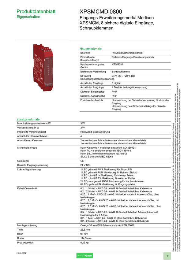XPSMCMDI0800 Moduł rozszerzający Schneider Electric XPSMCMDI0800