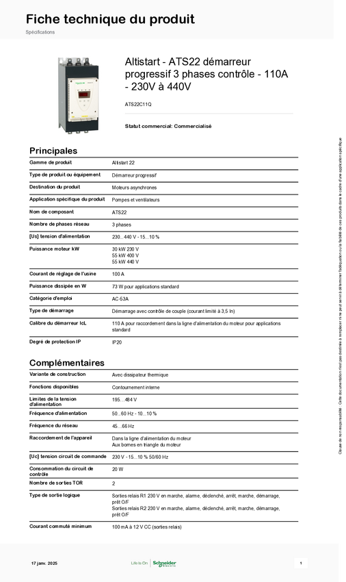 Schneider Electric ATS22C11Q Soft-start Moc silnika przy 400 V 55 kW