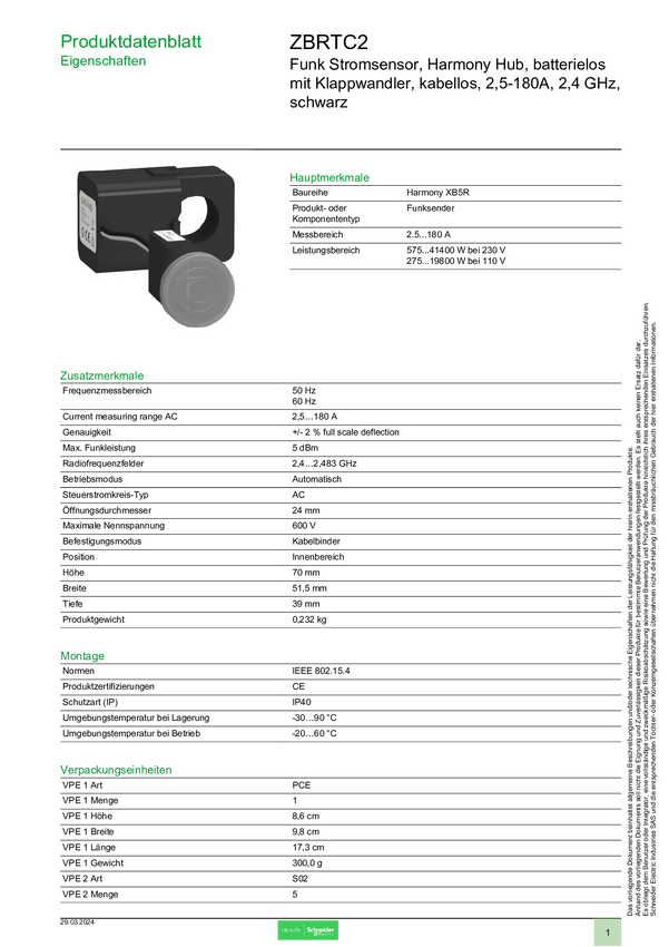 Schneider Electric Radiowy czujnik prądu, Harmony Hub, bezbateryjny ze składanym konwerterem, bezprzewodowy, 2,5-180A, 2