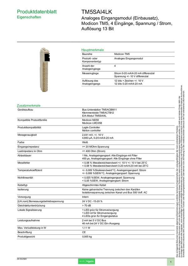 Moduł rozszerzeń Schneider Electric TM5SAI4LK