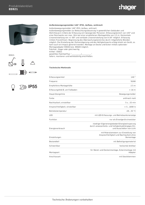 EE821 Czujnik ruchu Hager EE821 140 ° IP55 antracytowy