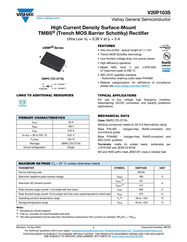 V20P103S High Current Density Surface-Mount TMBS® (Trench MOS Barrier Schottky)...