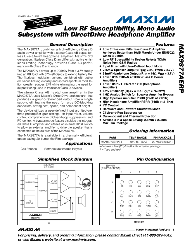 MAX9877AERP Low RF Susceptibility, Mono Audio Subsystem with DirectDrive Headphone Ampl...