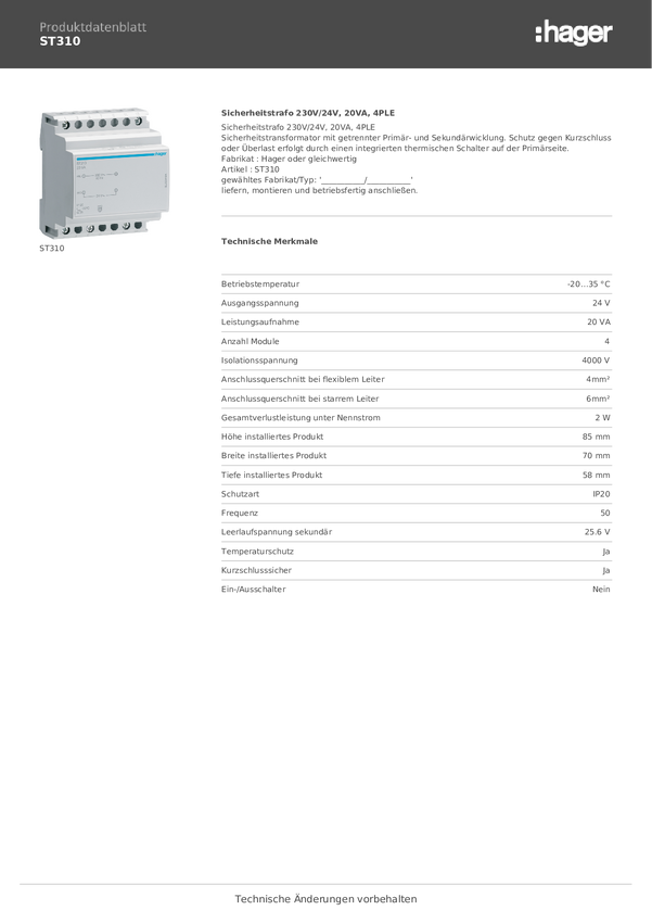 ST310 Transformator bezpieczeństwa Hager ST310, 24 V