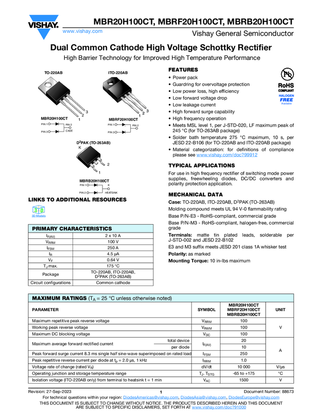 MBRB20H100CT Dual Common Cathode High Voltage Schottky Rectifier High Barrier Technology...