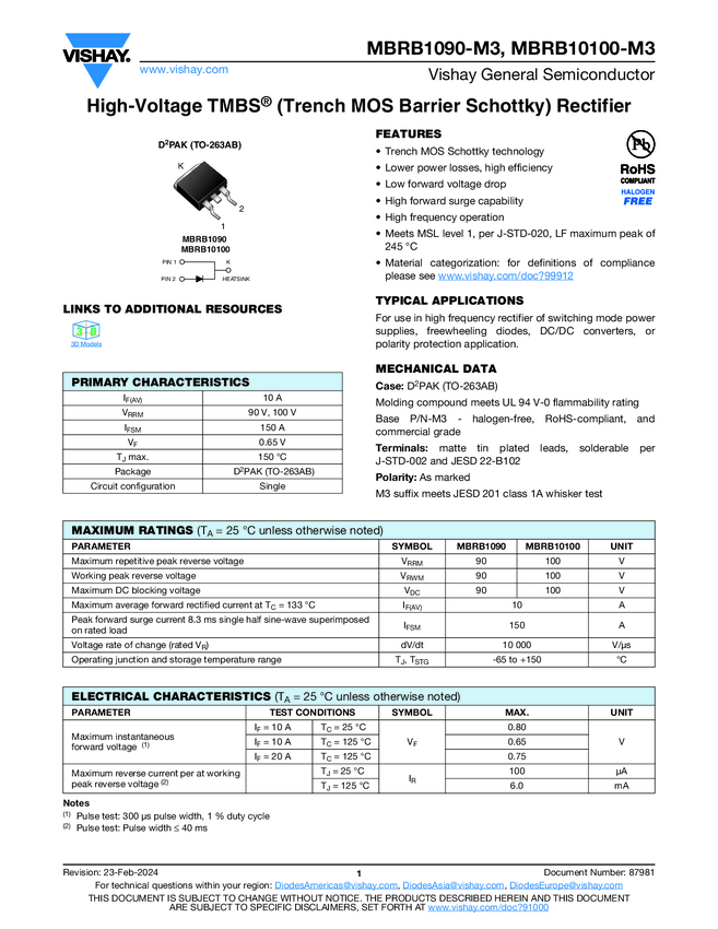 MBRB1090-M3 High-Voltage TMBS® (Trench MOS Barrier Schottky) Rectifier