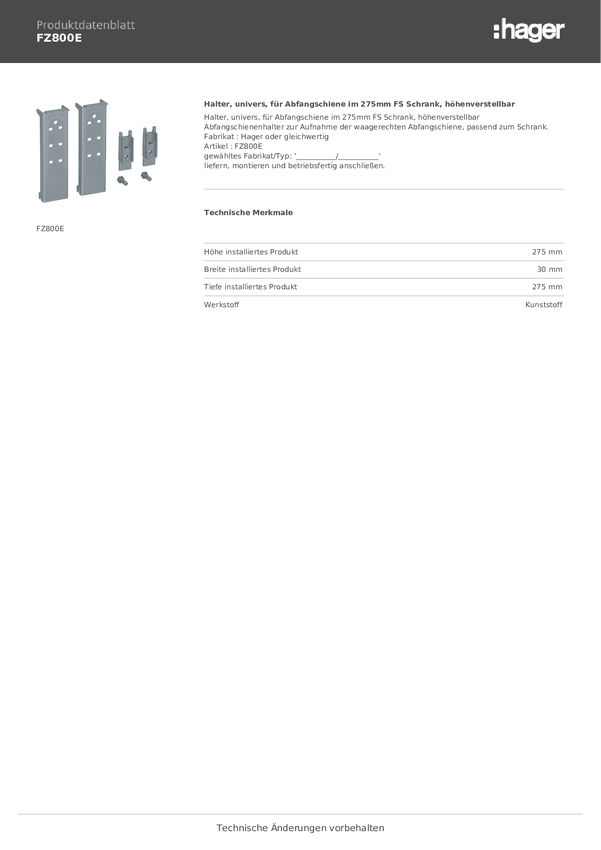 FZ800E Hager FZ800E Uchwyt tworzywo sztuczne biały 1 szt.