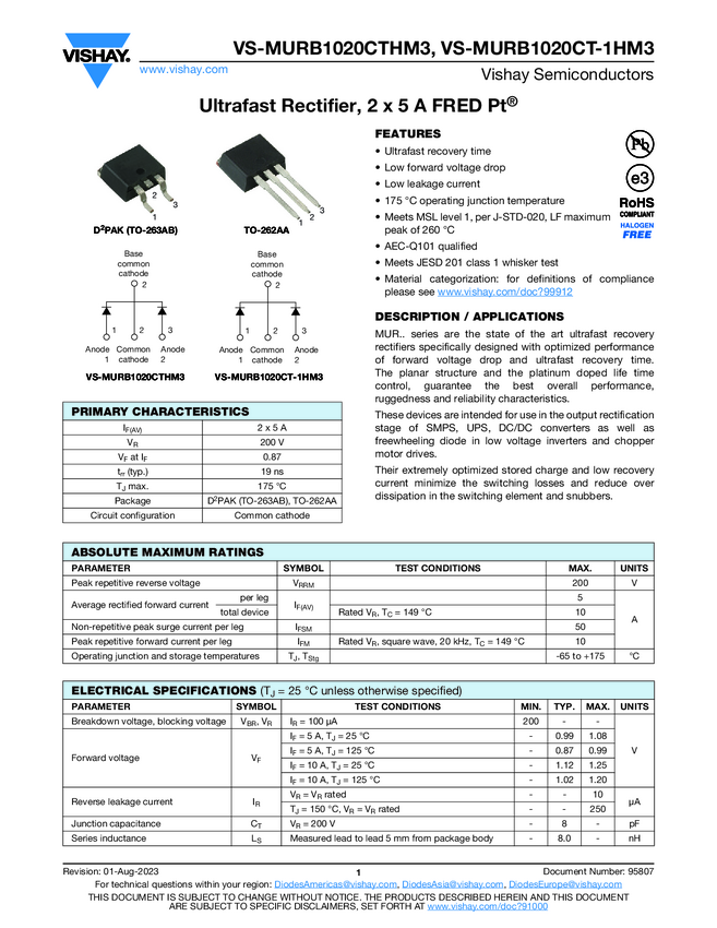 VS-MURB1020CTHM3 Ultrafast Rectifier, 2 x 5 A FRED Pt®